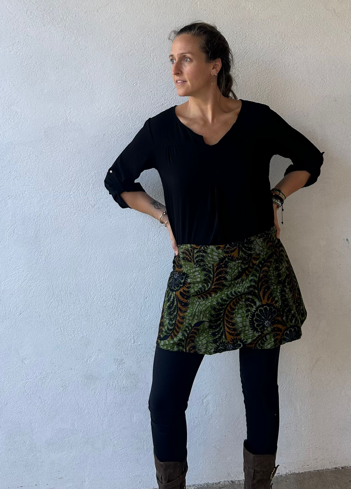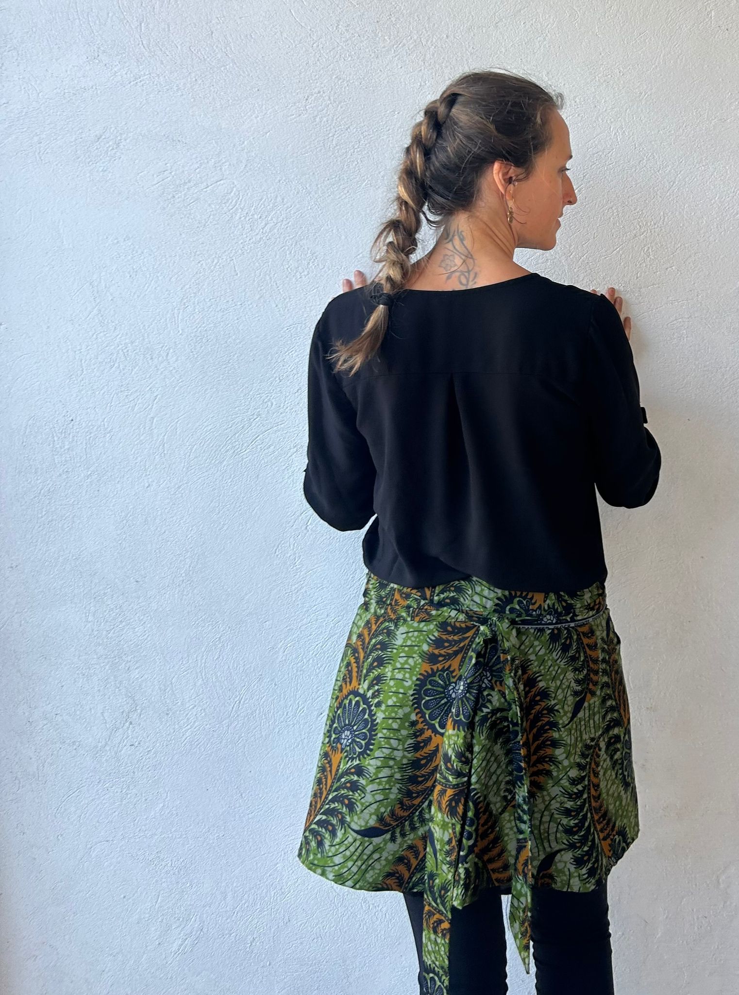 Minifalda estilo pareo con tela wax de algodón 100%.