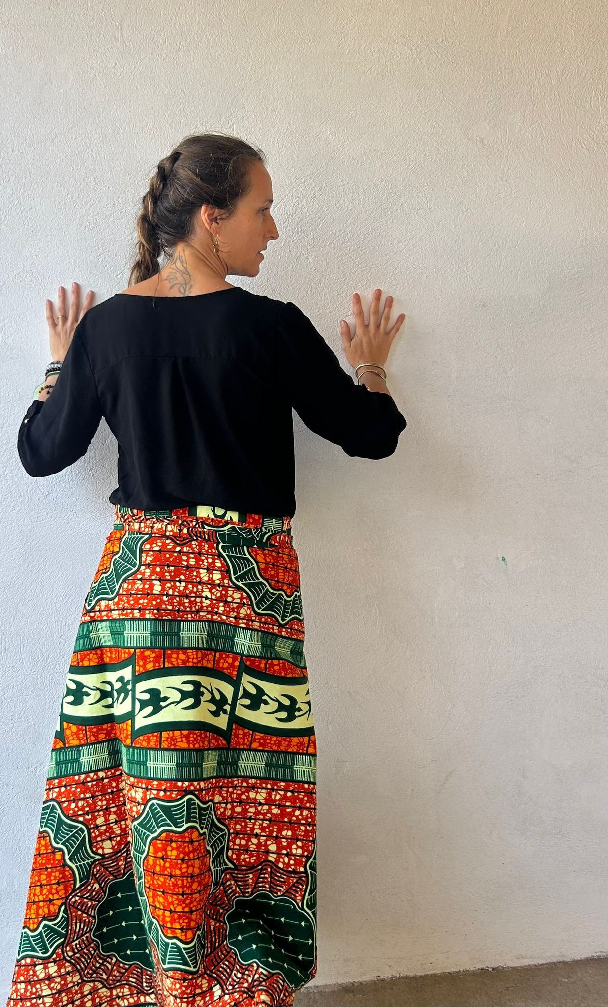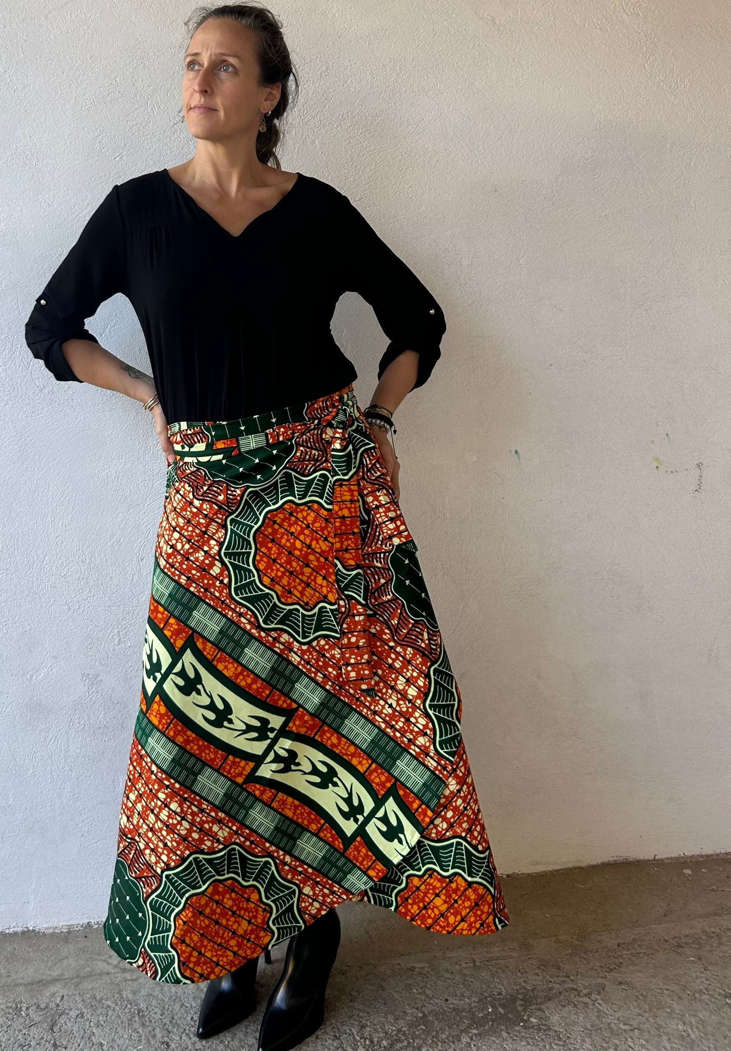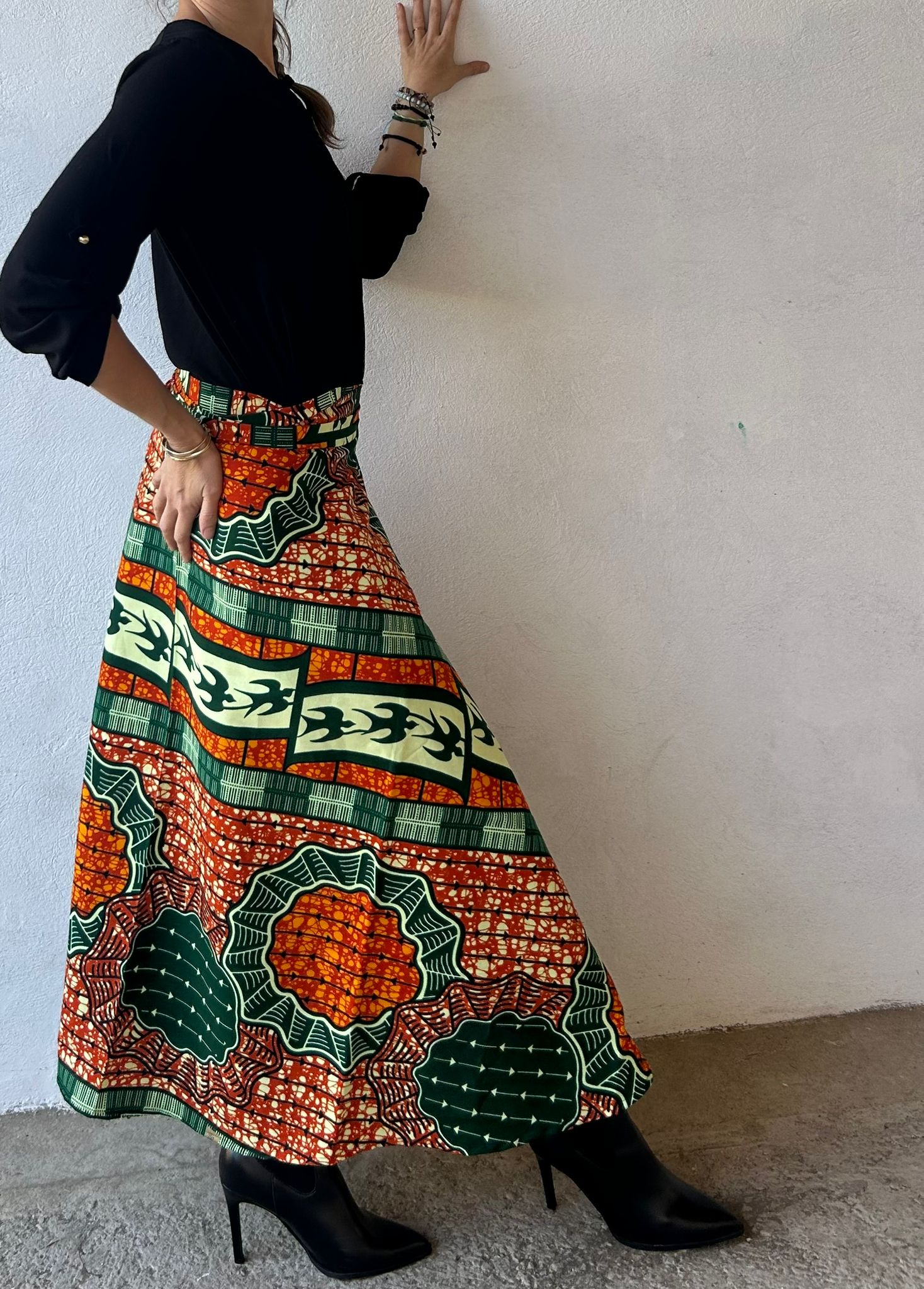 Falda larga tipo pareo ajustable a la cintura de cada una.